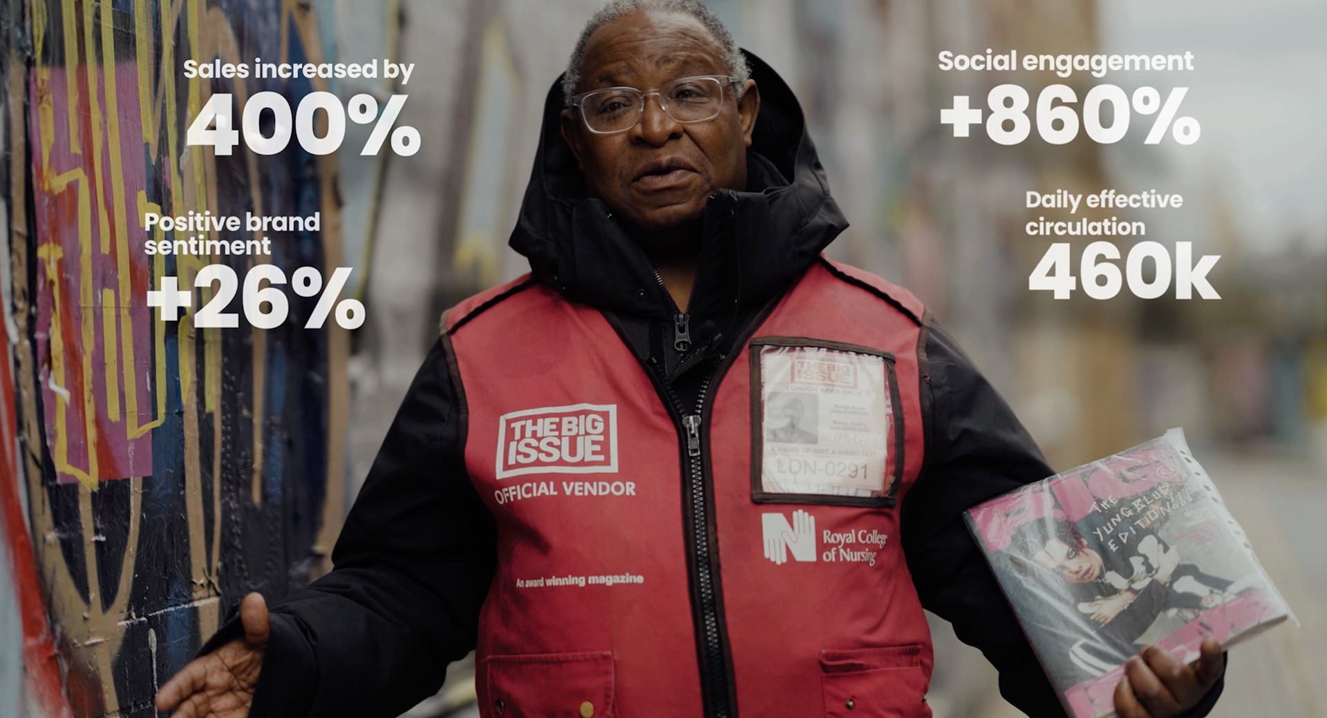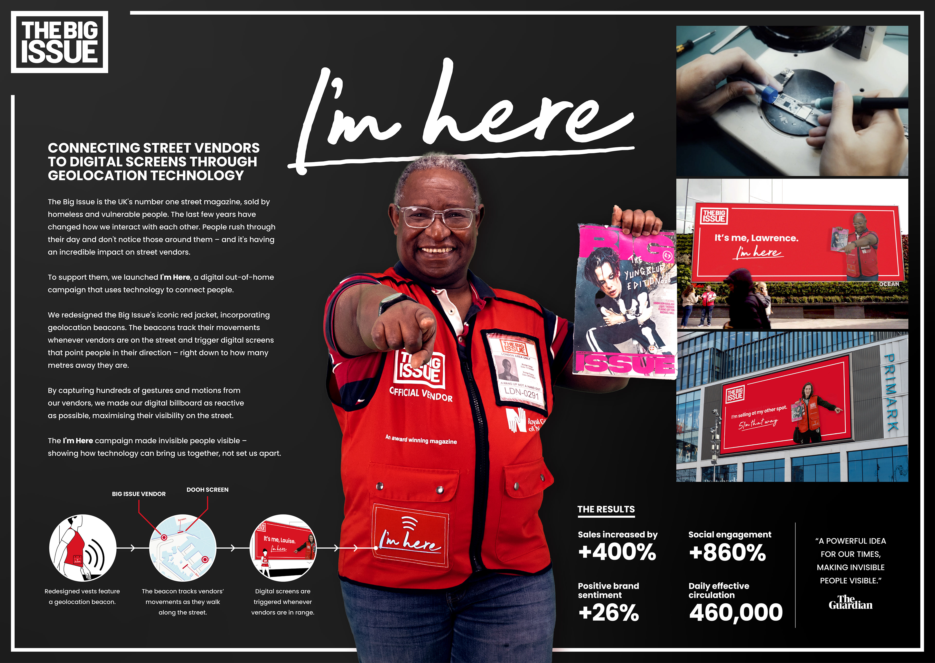 The Big Issue is the biggest street magazine in the UK, sold by vulnerable people. This campaign uses technology and media placement to make invisible people visible and help street vendors to improve their sales.